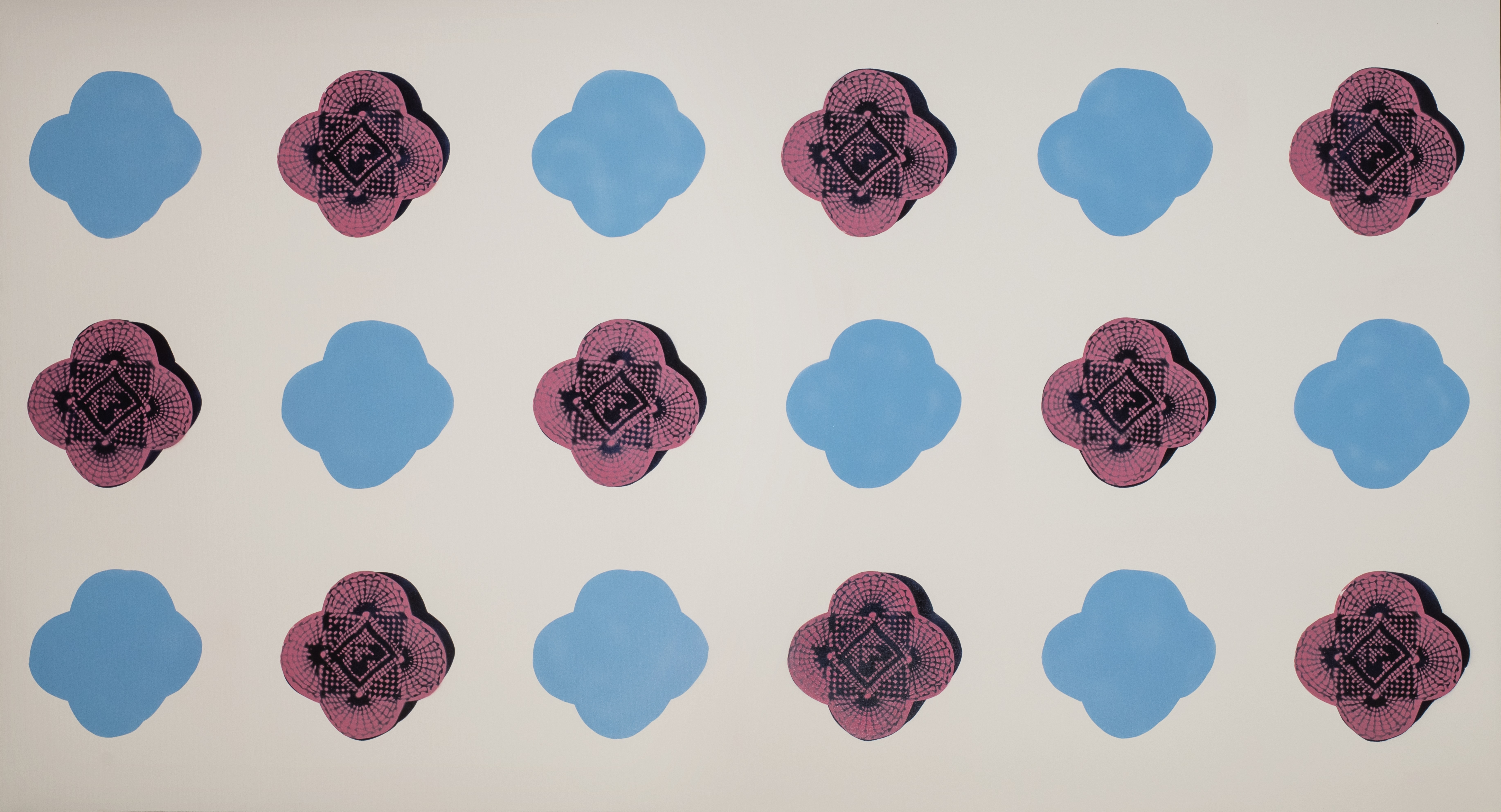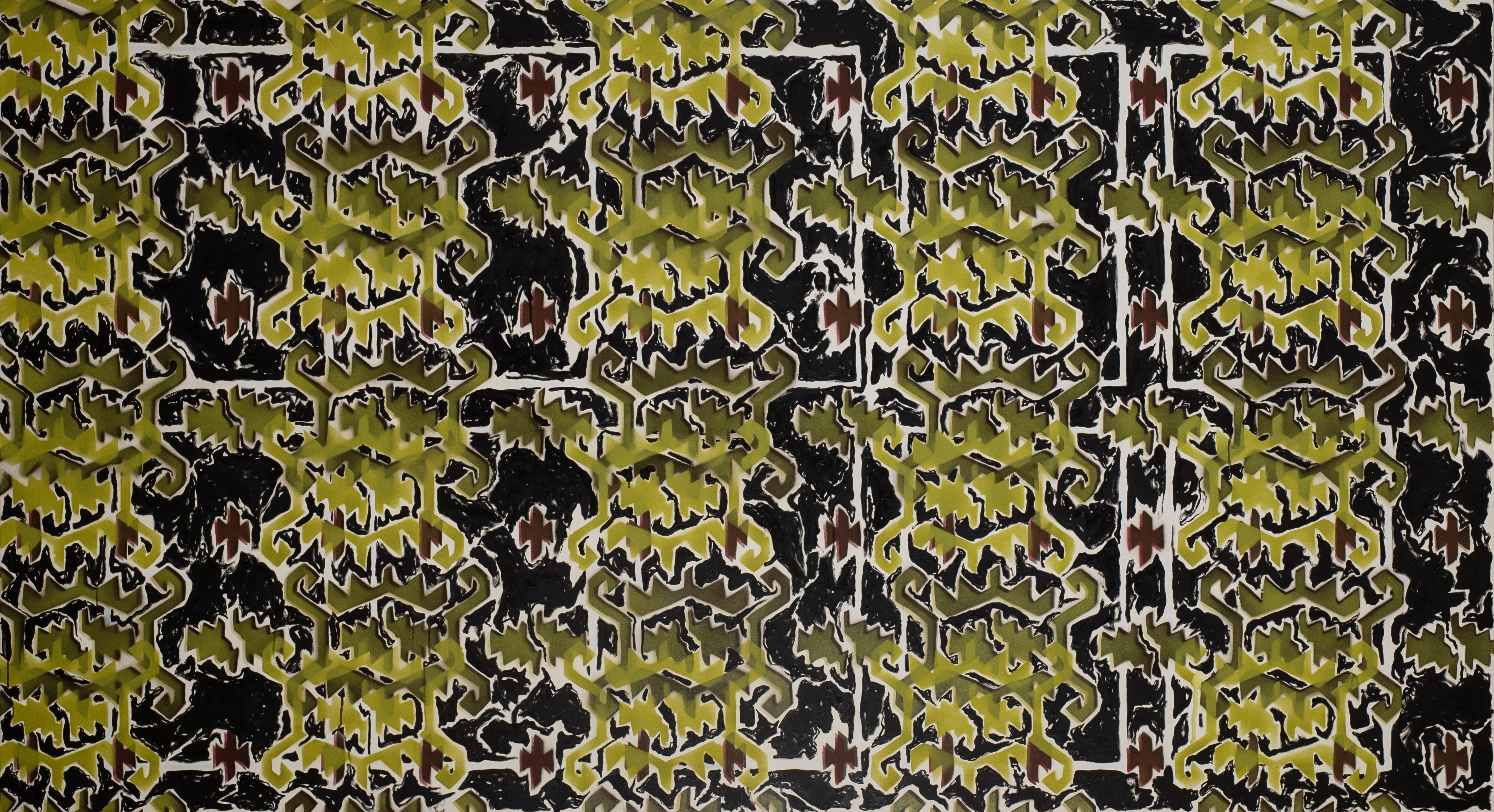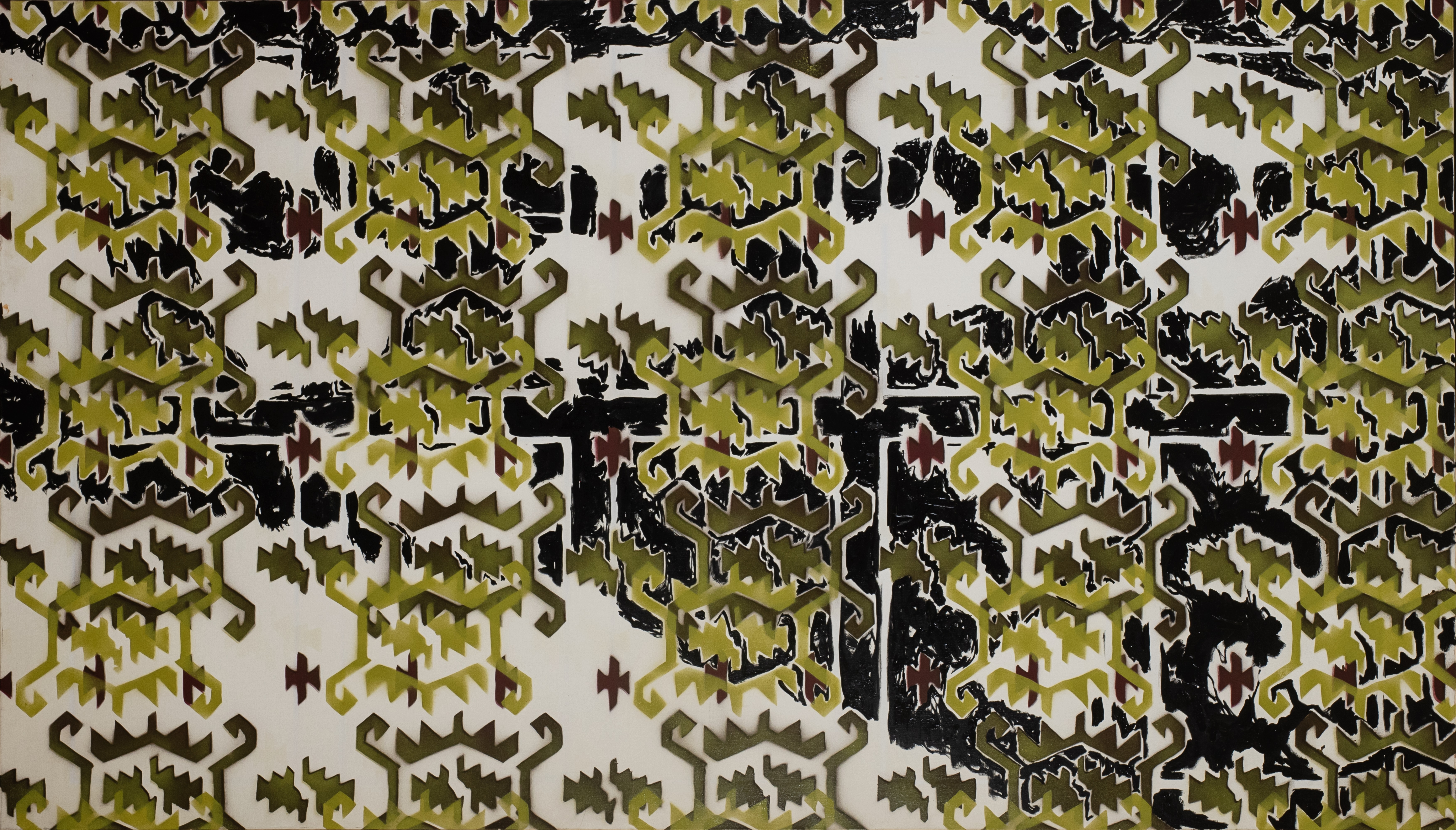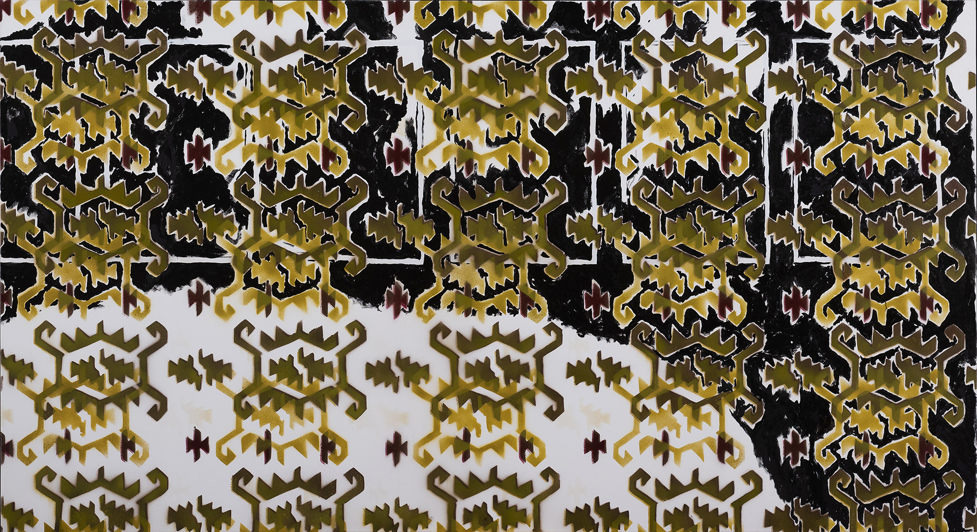 The chances of grasping the full meaning of the symbolism of old ornaments through the act of painting are equal to those of seizing the void. Nevertheless, that is how I tried to justify my artistic effort when my colleagues at ENSBA Paris, asked me Why are you spray-painting old ornaments in 2014?. I was being smug: My artistic effort might unlock a forgotten knowledge about my ancestors, some information which we all carry buried in our unconscious. This strategy is borrowed from the bag of contemporary artist’s tricks. It perverts the truth of nothing worth doing is ever easy, by relying on the fact that there is nothing harder than chasing the impossible. This logic further implies that unattainable goal brings absolute value. Vain and insecure artists hide behind the size of their cross. It is absurd to aim at a target you are bound to miss. Realizing my own deceitfulness, I named these paintings Zjale (holes, voids). It became a joke at my own expense, my vanity exposed.